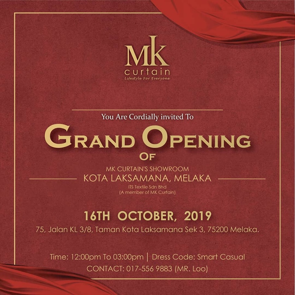 Di sini, kami ingin mengumumkan MK Curtain akan melancarkan "Grand Opening Event" di Kota Laksamana, Melaka. Tarikh: 16 Oktober 2019 Masa: 12.00pm - 3.00pm Untuk mendapatkan hadiah misteri & peluang untuk menyertai Cabutan Bertuah, cepat ajak kawan anda untuk datang sekali. Whatsapp to wasap.my/60182295000 Waze us at MK Curtain Kota Laksamana 75, Jalan KL 3/8, Taman Kota Laksamana, 75200 Melaka. #MKCurtain #Curtain #Langsir #Blinds #Wallpapers #MKCurtainKotaLaksamana #KotaLaksamana #GrandOpening #MKCareline0182295000 @ MK Curtain Kota Laksamana Melaka
