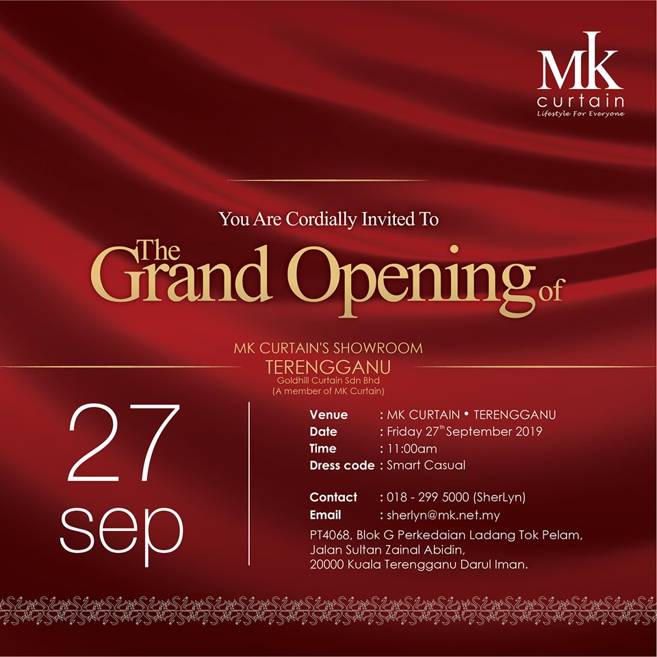 Visit MK Curtain team at Booth No. 62 & 63 for attractive promotions! Venue: Kota Bharu Trade Centre (KBTC) Date: 15th - 17th August 2019 Time: 10am-10pm