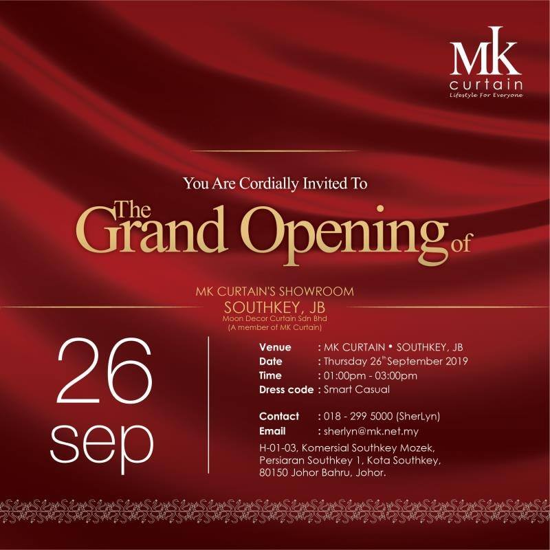 Dengan bangganya, anda telah dijemput ke Upacara Pembukaan cawangan MK Curtain! Tarikh: 26th September 2019 (Thursday) Masa: 1.00pm Lokasi Waze: MK Curtain @ Southkey JB H-01-03, Komersial Southkey Mozek, Persiaran Southkey 1, Kota Southkey, Johor Bahru, Johor. Kejutan dan hadiah misteri sedang menunggu anda!! Wasap.my/60182295000 #MKCurtain #Curtain #Langsir #SunblockCurtain #GrandOpening #MKCurtainSouthkey #MKCareline0182295000