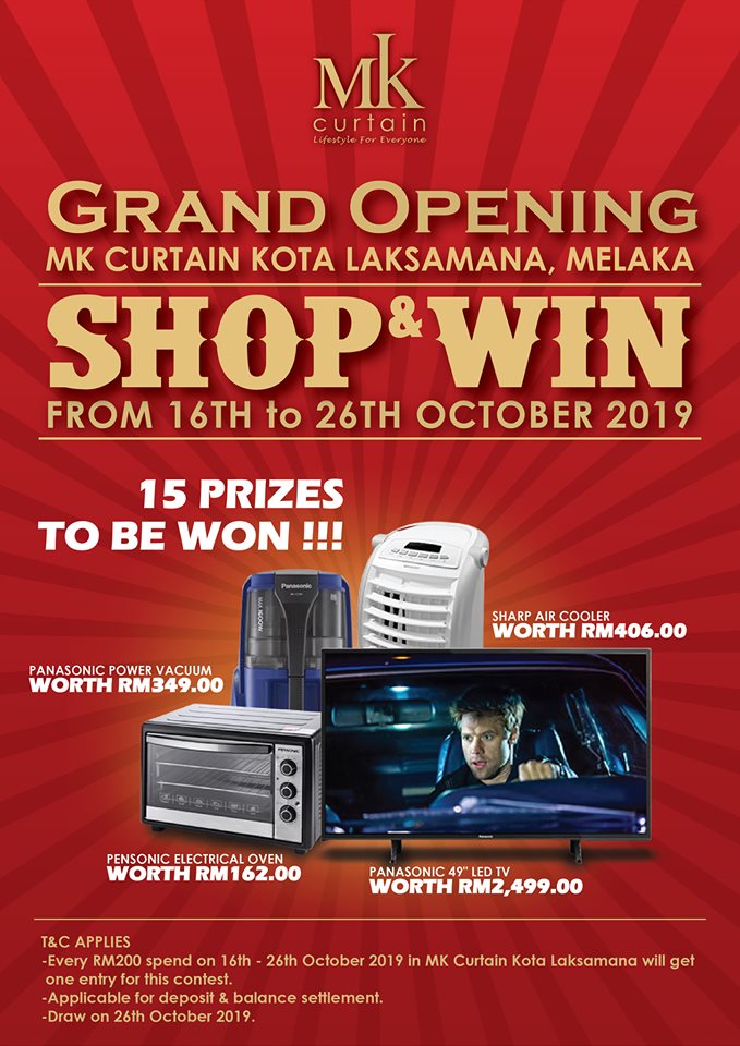 Melaka pada 16th Oktober hingga 26th Oktober 2019 untuk mendapatkan peluang untuk memenangi hadiah yang lumayan! Jangan lupa menghadiri "Grand Opening" pada 16th Oktober 2019 juga! Tunggu apa lagi? Jom ajak kawan-kawan dan ahli keluarga anda shopping! Whatsapp to wasap.my/60182295000 Waze us at MK Curtain Kota Laksamana 75, Jalan KL 3/8, Taman Kota Laksamana, 75200 Melaka. #MKCurtain #Langsir #Curtain #Blinds #Wallpaper #HomeDecor #MKCurtainKotaLaksamana #KotaLaksamana #Melaka #ShopandWin